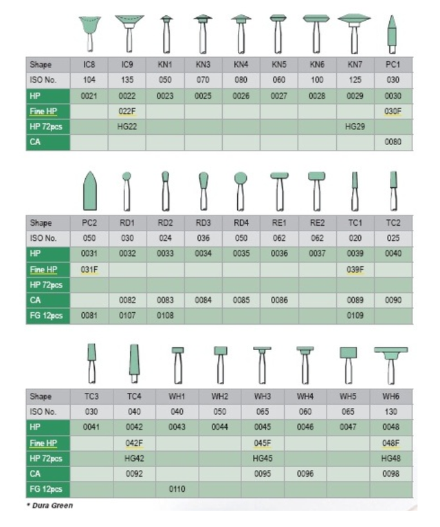 Dura-Green виготовлені з високоякісного карбіду кремнію і є винятковими для швидкого та осколкового контурів та обробки фарфорових, композитних, дорогоцінних сплавів та амальгами.