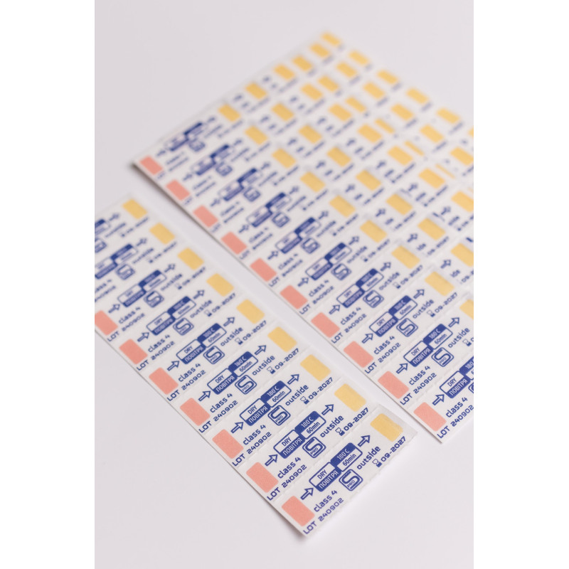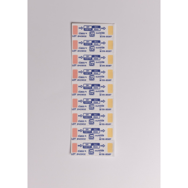 Індикатори повітряної стерилізації виробництва т.м. PROSTERIL (Україна) представляють собою одноразовий хімічний, багатопараметричний стикер з липким шаром на зворотному боці індикатора, призначений для режиму стерилізації і належать до 4 класу багатоперемінних індикаторів.